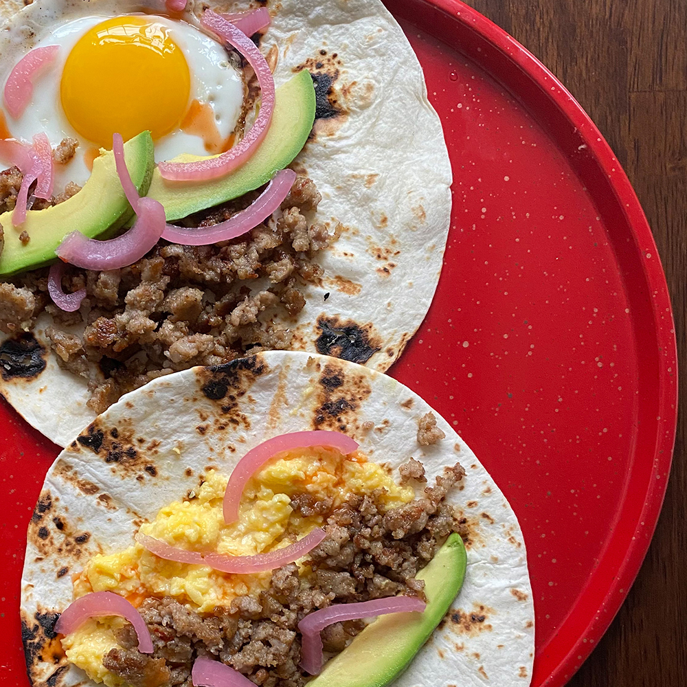 In a pan, brown and crumble your sausage patties until thoroughly cooked.