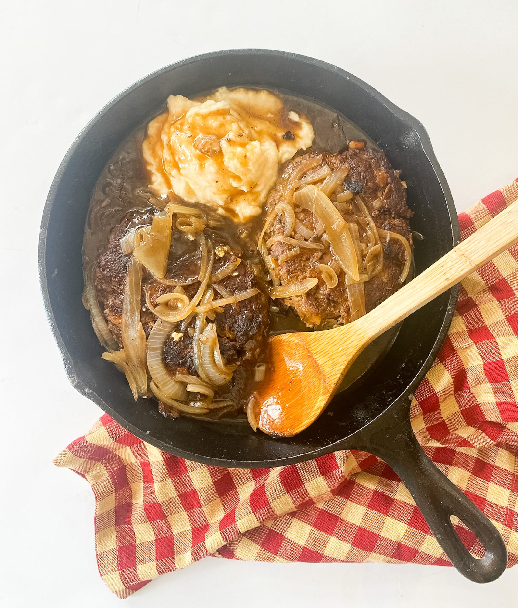 Return the cooked steak patties to the skillet and spoon the gravy over the top.