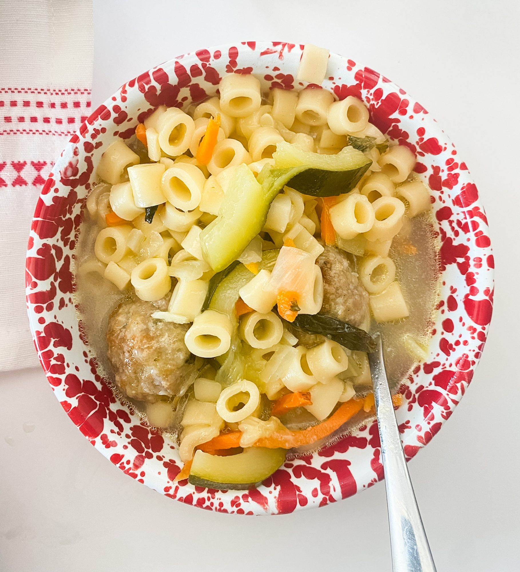 Whisk in chicken stock and bay leaves; bring to a boil. Stir in pasta, zucchini, and meatballs; reduce heat and simmer until pasta and zucchini are tender and meatballs are cooked through, about 10-12 minutes.